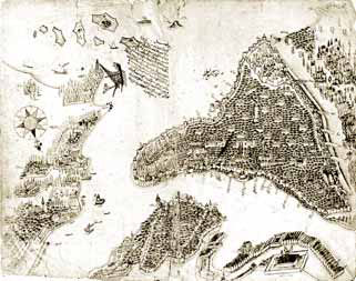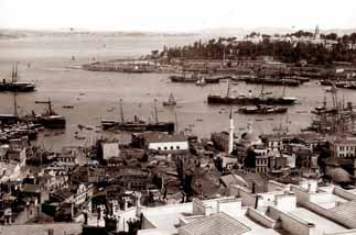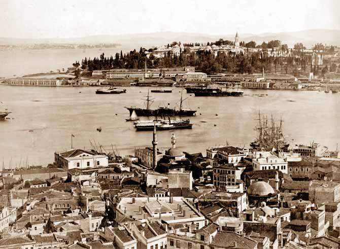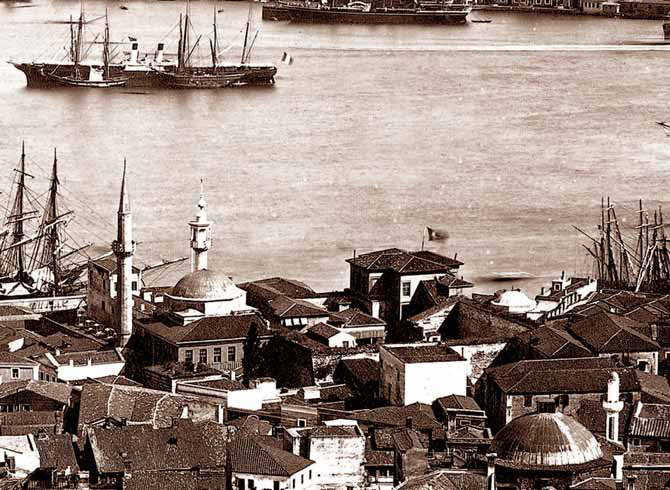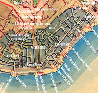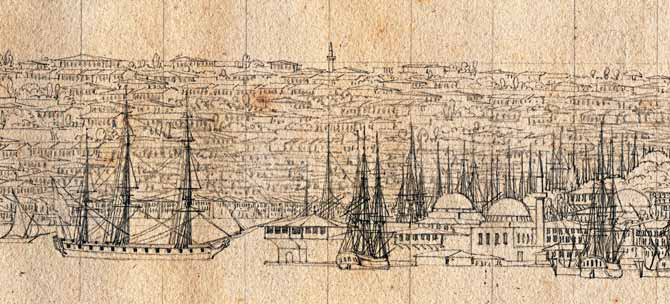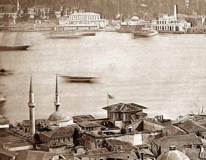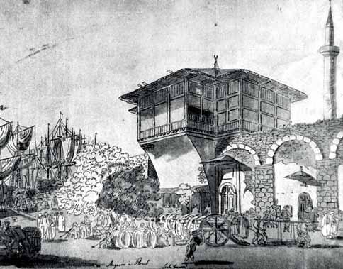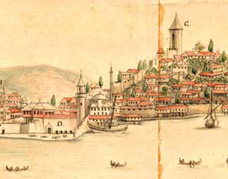 Üzerinde bayrak dalgalanan direk, dikkat edildiğinde Lewis’in çiziminde de görülmektedir. Yapının cephelerinde Lewis’in çizimine benzer kepenkli pencereler bulunmakta olup, çatısı alaturka kiremit kaplıdır. Hisarın konturlarını belirleyen yüksek duvarların bir bölümü net olarak belli olmaktadır. Solda, Kemankeş Mustafa Paşa Cami’nin kubbesinin gerisinde görülen minare Kurşunlu Mahzen Cami minaresi, daha solda yer alan minare ise Kemankeş Mustafa Paşa minaresidir.